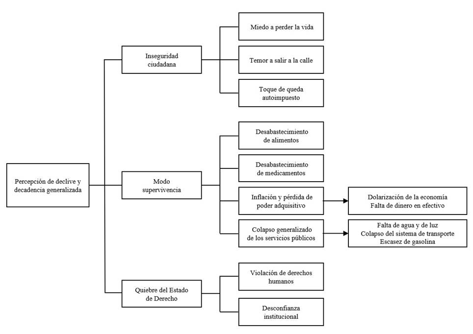 La red de códigos Decadencia y declive generalizado fue construida mediante la percepción que tenían los entrevistados en torno a la gestión gubernamental en tiempos de Nicolás Maduro. Esta red es de suma de relevancia para la presente investigación, pues permitió abordar, desde el concepto de migración forzada y modelo extractivista petrolero, las causas estructurales que desencadenaron la migración venezolana hacia Chile en el período 2017-2020, así como preguntarnos cómo el segundo colapso del modelo extractivista afectó la vida de las personas.