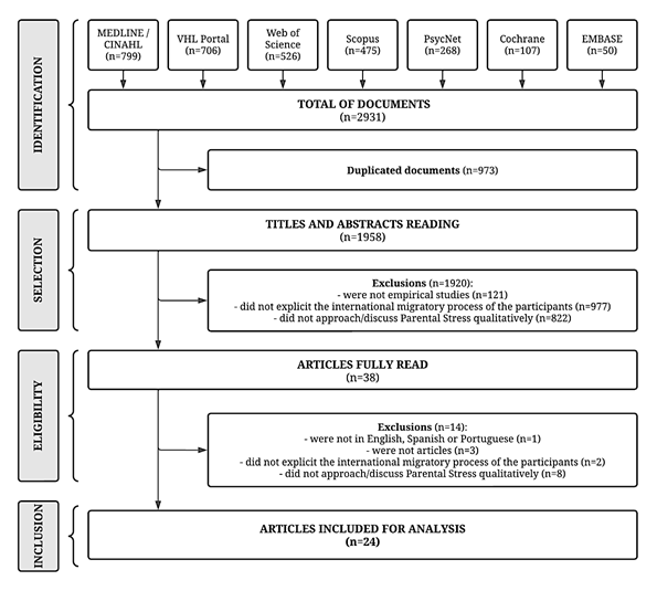 This meta-synthesis followed the systematic recommendations proposed by two different protocols: the Preferred Reporting Items for Systematic Reviews and Meta-Analyses - PRISMA (Page et al., 2021) for selection and inclusion of the studies, and Lachal et al. (2017) guidelines for analysis and synthesis of the reported findings. Searches were carried out in seven international databases: Scopus, Web of Science, PsycInfo, VHL Portal, MEDLINE/CINAHL, EMBASE, and Cochrane Library, using the following descriptors in English: [migra* and parental stress], [immigra* and parental stress], and [refug* and parental stress].