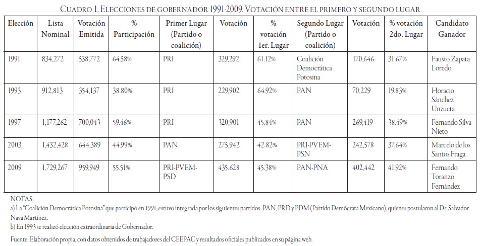 Otro aspecto importante sobre el que nos gustaría hacer énfasis es el hecho de que la distancia entre el PRI y el segundo lugar fue disminuyendo de forma sensible en los años noventa, lo que da cuenta de la vitalidad de la oposición política en la entidad durante esos años. Dicho impulso conoció un momento de éxito en 2003, cuando los potosinos decidieron en las urnas dar su confianza al candidato del PAN de forma mayoritaria, para seis años después otorgarla de regreso a una alianza de partidos encabezada por un miembro del PRI, quien había fungido como miembro del gabinete del gobierno del PAN durante el periodo 2003-2009 como secretario de Salud.