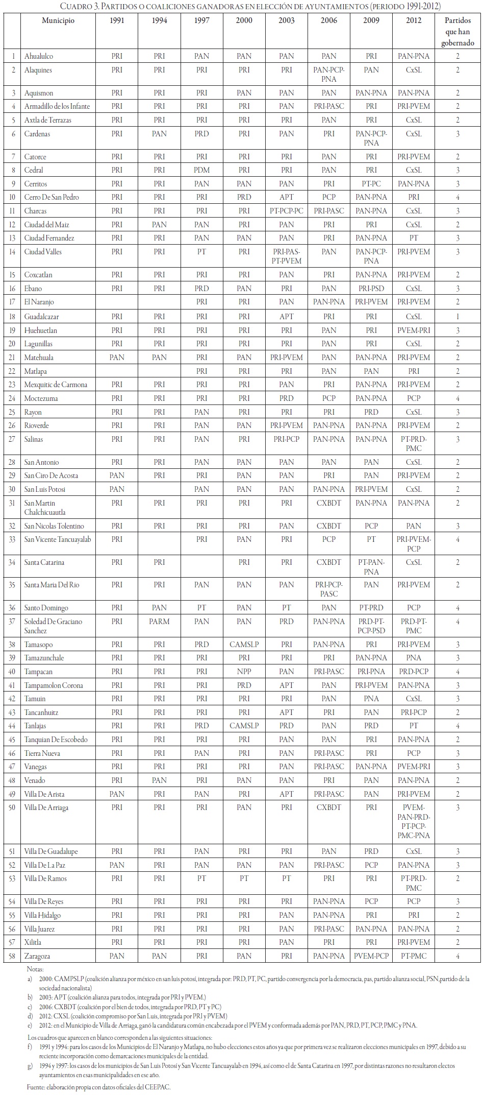 Resulta altamente notorio que sólo un ayuntamiento no haya registrado alternancia en el periodo de estudio. Se trata del municipio de Guadalcázar, ubicado en el altiplano potosino, donde el PRI se ha mantenido como la fuerza predominante. Lo importante aquí es que se trata de una excepción. Más allá de las distintas explicaciones que puedan construirse en torno al continuado control político del PRI en este ayuntamiento que pueden ir desde la falta de aptitud política de la oposición hasta el mantenimiento de prácticas no democráticas del control político, entre otras, para el objetivo de este trabajo lo que interesa resaltar tiene que ver con la identificación de la singularidad del caso, en un entorno institucional y político crecientemente más confiable y competitivo.