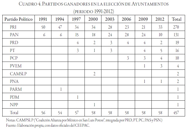 Considerando las elecciones más recientes, conviene mencionar que durante el proceso electoral de 2011-2012 encontramos que la voluntad de los potosinos se orientó mayoritariamente en favor del partido en el gobierno. Lo que encontramos después de julio de 2012 es un electorado que decidió, desde luego no de manera exclusiva, dar su confianza al PRI. Vale puntualizar que en el Congreso local el PRI, junto a su aliado el PVEM, cuenta con la mayoría absoluta 14 diputados de un total de 27 que integran la LX Legislatura en el estado, aunque no con la mayoría calificada que le permitiría llevar adelante modificaciones constitucionales. De igual modo, el PRI, con la ayuda de coaliciones y candidaturas comunes, obtuvo el triunfo en 35 de los 58 ayuntamientos del estado, entre los que destacan los municipios más importantes económica, política y socialmente, a saber, San Luis Potosí, Matehuala, Rioverde y Ciudad Valles. De igual forma, obtuvo el triunfo en cinco de las siete diputaciones federales.