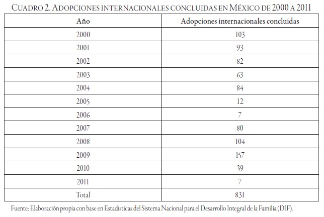 En el cuadro 1 el proceso de las adopciones internacionales según el Convenio de la Haya México hasta la década de los ochenta comenzó a tener un movimiento considerable en las adopciones internacionales, en comparación con otros países de la región como Guatemala o Colombia. Según registros del Sistema Nacional para el Desarrollo Integral de la Familia (DIF) y de los Sistema Estatales DIF de 1995 a 2000 se realizaron un total de 808 adopciones internacionales (Cárdenas, 2006:41). En cambio, de 2000 a 2011 se realizaron 831 adopciones internacionales.