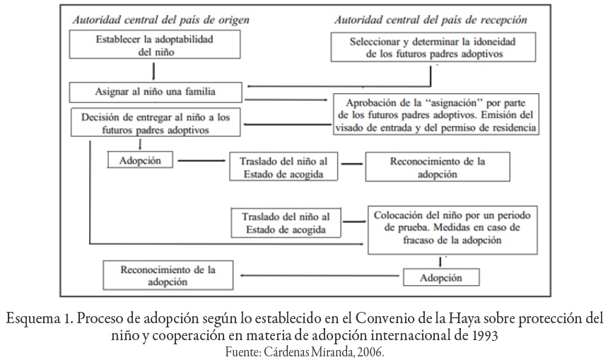 A diferencia de los instrumentos internacionales anteriores en materia de infancia y adopciones internacionales, el Convenio de La Haya estableció un marco de normas y estándares para garantizar los derechos de los niños en los Estados de origen y de destino durante el proceso de la adopción transnacional (Wesler, 2010:25). Asimismo, el Convenio de La Haya estipula que la adopción internacional es una opción después de la adopción nacional, pero "reconoce que para el desarrollo armónico de su personalidad, el niño debe crecer en un medio familiar, en un clima de felicidad, amor y comprensión [...] y que la adopción internacional puede presentar la ventaja de dar una familia permanente a un niño que no puede encontrar una familia adecuada en su Estado de origen" (HCCH, 1993).