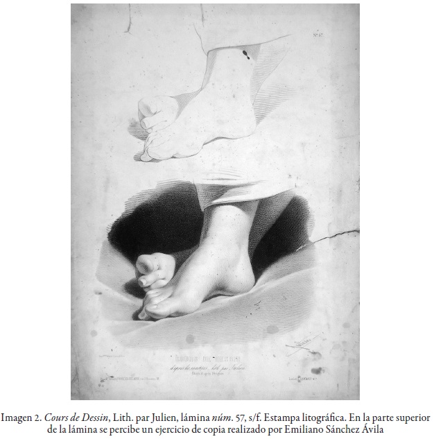 Asimismo, en este mismo archivo fueron encontradas dos estampas litográficas realizadas por el francés Julien,3 cuyos trabajos fueron modelos de las más prestigiadas escuelas de arte académico (Antiguo Colegio de San Ildefonso, 1999:300), por lo que se refuerza la idea de que los cursos de dibujo y estampas litográficas como material didáctico para la enseñanza de dibujo tenían gran circulación en el interior de la república (véase la imagen 2).