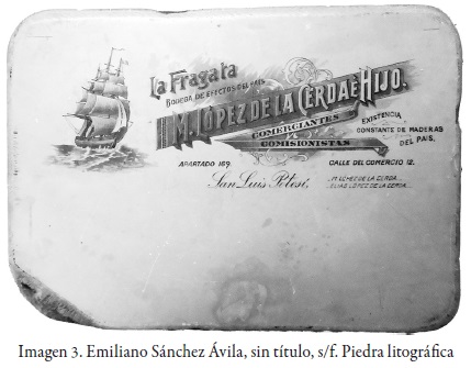 Desde principios del siglo XX, Al Libro Mayor contó con Emiliano Sánchez Ávila como maestro litógrafo (Calvillo, 1990), con ello queda de manifiesto que fue colaborador y creador de las tarjetas, etiquetas y anuncios de fina manufactura de dicha empresa. Así, la labor de Emiliano en este ramo permanece inserta en la historia de una de las empresas más notables de la ciudad de San Luis Potosí. Su trabajo con los Kaiser y sus trabajos litográficos independientes manifiestan, por un lado, la gran calidad de su dibujo (recordemos que el dibujo es la base de la litografía) (véase la imagen 3) y, por el otro, su versatilidad como actor social en la dinámica laboral del San Luis porfiriano.