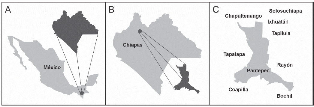 Mapa 1 Ubicación de Chiapas (A), Pantepec (B) y municipios de la RNC (C).