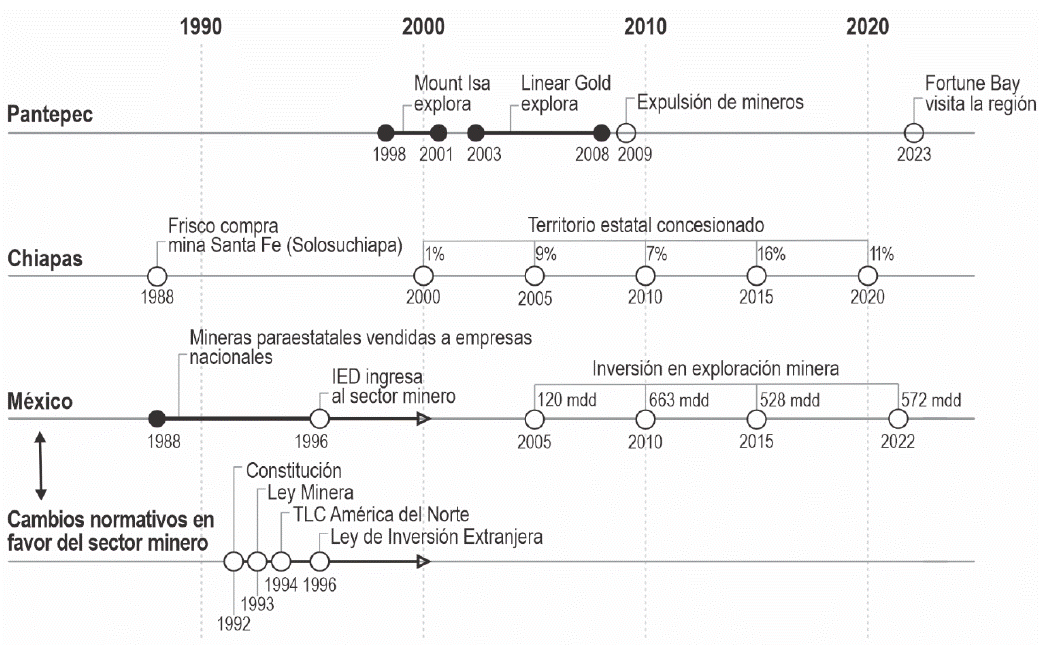En la Gráfica 1 se presenta en líneas de tiempo un conjunto de eventos que anteceden y contextualizan la exploración minera en Pantepec. Debido al auge del neoliberalismo global, en el período 1988-1996 el gobierno federal de México vendió las mineras paraestatales y concesionó las reservas mineras a empresas nacionales (Delgado Wise y Del Pozo, 2005; López Bárcenas, 2017, p. 127); es así como en 1988 la empresa Minera Frisco (Frisco, en adelante) obtuvo una primera concesión en Solosuchiapa, en 54 hectáreas, donde se encuentra la entrada a la mina Santa Fe, una zona cercana a las tierras de Pantepec.