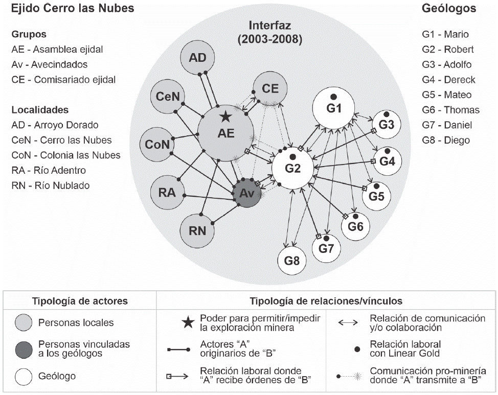 En la Gráfica 2 se representa la interfaz de los actores vinculados a la exploración minera en el Ejido Cerro las Nubes, en Pantepec. En el grupo de geólogos estaban los mexicanos Adolfo, Daniel, Diego, Mario y Mateo, y los extranjeros Dereck, Robert y Thomas. Linear Gold designó a Mario director de exploración y a Robert jefe de geólogos. Aparentemente, el rango superior de Mario explica que sea escasamente recordado en las localidades de Pantepec, además de que fue Robert -apoyado por Dereck- quien gestionó el trabajo en campo y las relaciones con el comisariado ejidal, la asamblea de ejidatarios y los avecindados.