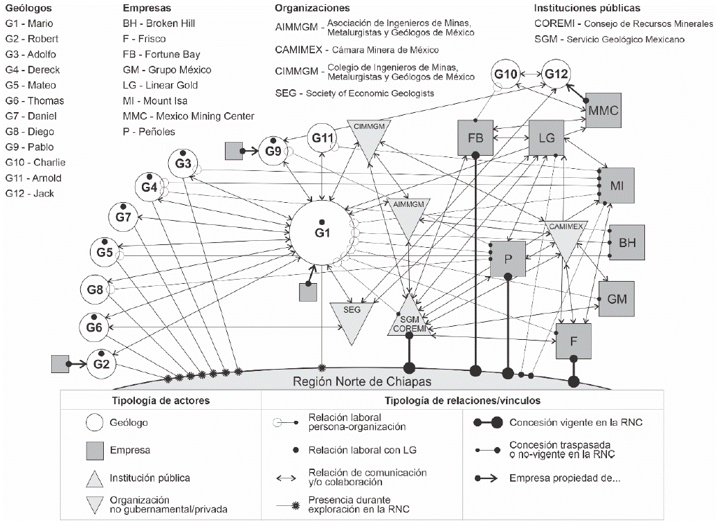 La minería inicia desde la exploración de los lugares donde se pretenda realizar la actividad, con la intervención in situ de los geólogos. En la RNC, durante el período 1988-2022, el crecimiento exponencial de la superficie concesionada a empresas mineras fue la consecuencia de campañas de exploración en la región. Con base en la POA, se identificó el vínculo de una red de actores del sector minero, formada por 12 geólogos, ocho empresas, cuatro organizaciones y dos instituciones públicas (véase la Gráfica 3).
