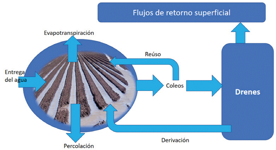 En este sentido, las pérdidas por escurrimiento superficial de una parcela pueden ser recuperadas aguas abajo y usarse para regar otras parcelas en lo que se conoce como coleos de riego o reúso de agua de drenaje superficial agrícola. Por ejemplo, cuando una porción de estos volúmenes no sale de la zona de riego puede ser reutilizada en la misma zona; pero cuando otra porción sale de la zona de riego puede alimentar corrientes superficiales o recargar acuíferos (véase el Gráfico 2).