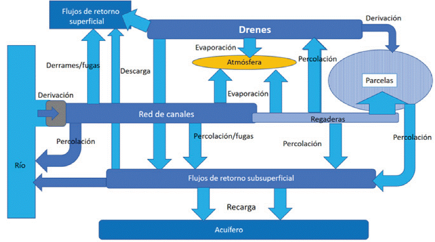 En una zona de riego, dichos flujos de agua son conocidos integralmente como retornos de riego y provienen tanto del riego parcelario como de la red de distribución y drenaje (o flujos) superficial o subterráneo. Los retornos de riego son los principales flujos afectados por los esquemas de tecnificación de los sistemas de riego parcelarios y el entubamiento o revestimiento de canales. Por ello, es indispensable conocer cómo estos esquemas de tecnificación repercuten de modo negativo tanto en los flujos de retorno como en la percolación de los canales o regaderas de riego.