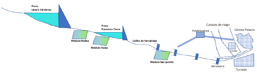 De acuerdo con la base de datos del Registro Público de Derechos de Agua (REPDA) (CONAGUA, 2023b), las fuentes de abastecimiento superficiales del DR017 son los ríos Nazas y Aguanaval. En el primero, los cauces son controlados por las presas Lázaro Cárdenas y Francisco Zarco, conocidas localmente como Palmito y Las Tórtolas, respectivamente. Ambas presas abastecen a 17 módulos de riego (del I al XVII) y concentran el 93.2 por ciento de la superficie regable. El río Aguanaval presenta una serie de derivaciones directas que abastecen a los tres módulos restantes (XVIII, XIX y XX) y que corresponden al 6.8 por ciento de la superficie regable y remanente del distrito. El volumen anual concesionado del DR017 es de 1 024.46 hectómetros cúbicos (hm3), con 976.66 hm3 de las dos presas para 17 módulos y 47.8 hm3 de las derivaciones del río Aguanaval para los tres módulos que no cuentan con abastecimiento de presas de almacenamiento.