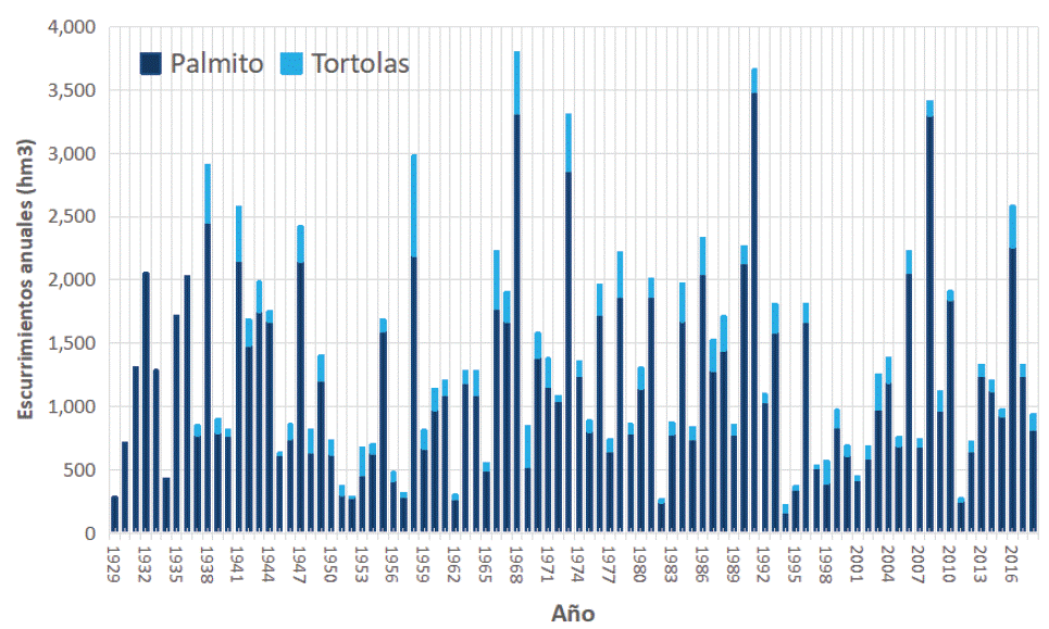 La aportación media a las presas Lázaro Cárdenas, en el período 1929-2018, y Francisco Zarco, en el período 1937-2018, fue de 1 179 y 161 hm3, respectivamente. Las aportaciones del sistema de presas que abastecen al DR017 ocurren de julio a octubre y muestran alta variabilidad interanual, como se ve en el Gráfico 4, que ha significado una variación anual de la superficie regable de la zona del Nazas en el rango de 12 mil a 71 mil hectáreas en los últimos 25 años. El período de riegos de este Distrito, abastecido de aguas superficiales, es de marzo a julio.