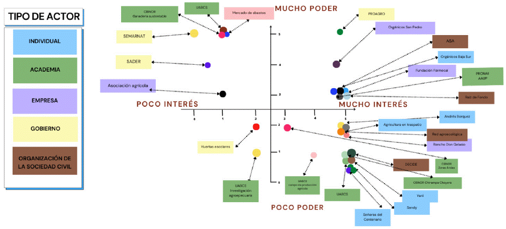 A partir del análisis de los grupos de interés, para la identificación, la comprensión y la priorización de aquellos que pueden ejercer influencia o poder sobre la masificación de las prácticas agroecológicas, fue relevante distinguir varios grupos de actores con mucho interés y poco poder. Se trata de la academia, experiencias individuales, empresas como Orgánicos San Pedro, Fundación Farmecal, Rancho Don Gelasio y Raíz de Fondo, A. C.