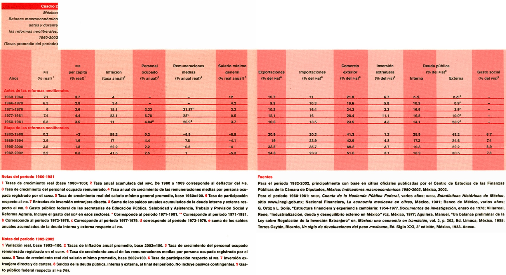 En el lapso reformador que va de 1982 a 2002, el PIB promedió un crecimiento de 2.2%, el PIB por habitante 0.3°/o y la inflación registró 41.5%. El número de mexicanos ocupados creció 2.5%, pero las remuneraciones promedio en sólo 1%, El comercio exterior -exportaciones más importaciones-rebasó 50% del PIB, las inversiones extranjeras representaron 3.1% del PIB y el saldo de la deuda pública casi la mitad de ese agregado. El desempeño de los tiempos previos a las reformas resultó, en todos los casos, superior (véanse los cuadros 2 y 3).