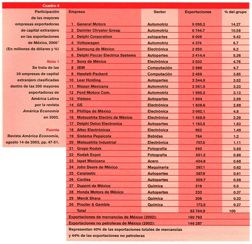 El notable crecimiento del comercio exterior durante la era de las reformas, se ha acompañado de una profundización de su concentración. En la actualidad, sólo 30 empresas extranjeras localizadas en México realizan 40% de las exportaciones totales de mercancías y 44% de las no petroleras de nuestro país con el mundo y son, además, de las 200 que más exportan desde América Latina (véase el cuadro 4).