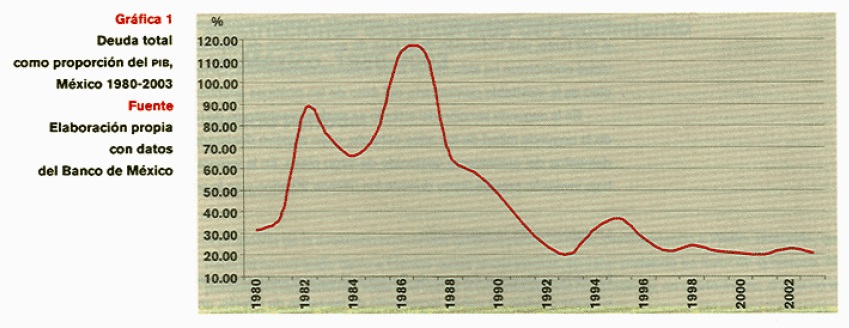 El papel del comercio internacional como fuerza motriz del crecimiento fue propuesto inicialmente por Robertson3 (1938) en el contexto de la Gran Depresión de los años treinta; recientemente ha sido replanteado por Balassa (1978) y por el llamado Consenso de Washington como panacea de los males de los países en desarrollo. De ahí la apertura comercial unilateral de la economía mexicana: entre 1982 y 1988 el valor de la importación controlado disminuyó de 100 a 19.7 por ciento y el arancel promedio de 27 a 10.4 por ciento (Flores 1998). Por otra parte, el Plan Brady contribuyó a reducir el fardo de la deuda (véase la gráfica 1) y facilitó la reanudación de los flujos de ahorro externo, mientras que la LF propició los cambios institucionales que se estimaban necesarios para incrementar el ahorro y la inversión extranjera. Asimismo, la estabilización de la inflación fue una pieza clave para garantizar el acceso a los mercados financieros internacionales. A tal efecto, se aplicaron las siguientes medidas esenciales: a) restricción monetaria; b) políticas de austeridad para conseguir superávit fiscal primario;4 c) el régimen de tipo de cambio fungió como ancla de la inflación durante 1988-1994; d) apertura unilateral del mercado interno, y e) venta de los activos públicos al capital extranjero. De este modo se juzgaba que la primera fase de la reforma sentaría las bases para el crecimiento sostenido de la inversión y de la actividad económica.