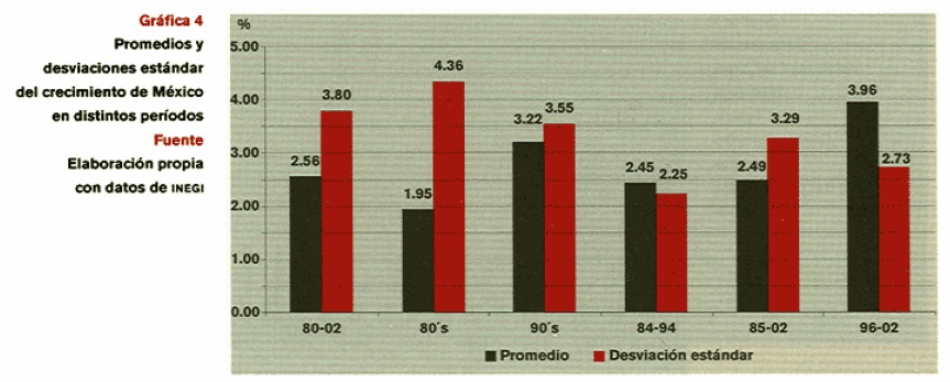 A 20 años de políticas de estabilización y reforma económica, los resultados no parecen corresponder a las expectativas. Las gráficas 4 y 5 y el cuadro 1 revelan un comportamiento no satisfactorio de la economía mexicana en comparación con el período 1960-1980, amén de que la tasa de crecimiento se volvió más inestable.