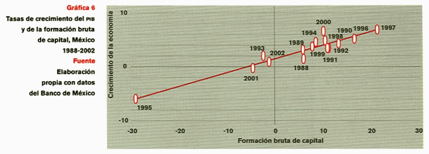 En la evolución económica reciente de México se constata una alta correlación positiva entre la formación de capital y la actividad económica (véase la gráfica 6). Sin duda la inversión productiva es uno de los determinantes más importantes del crecimiento y el desarrollo económicos porque es fuente de capacidad productiva y de demanda efectiva, de progreso técnico, acumulación de capital humano, economías de escala y de desarrollo institucional. En último análisis, la inversión es también el eslabón que conecta las relaciones dinámicas entre los ciclos, el crecimiento, los cambios estructurales y el desarrollo. El comportamiento de la economía depende de la tasa de inversión. Aun la estabilidad financiera depende de las expectativas de la inversión futura. De ahí la importancia de mantener un régimen de alta inversión estable (RAIE). Un régimen de inversión a la baja sólo aumenta la volatilidad de la economía y la inestabilidad financiera. Por ejemplo, en 1980 el PIB creció 8.33% gracias a una de las más altas tasas de inversión (27.2%) registradas en la historia moderna de México, mientras que en1988 la inversión se desplomó a 16.8% y el crecimiento fue magro (1.3%).
