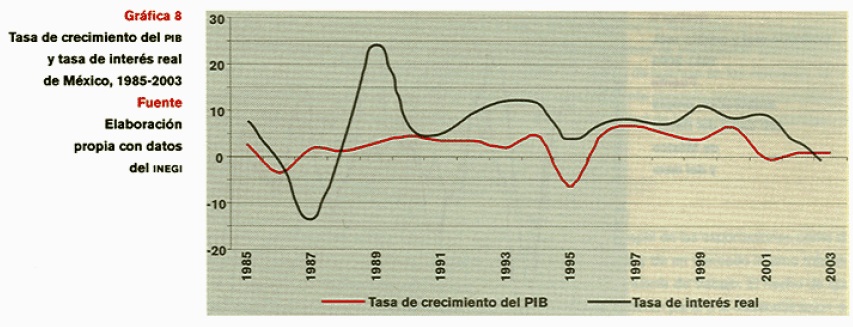 Sin embargo, los sectores favorecidos por el auge de crédito contrataron deuda en términos nominales en el marco de una macroeconomía de baja inflación y de tasas de interés reales y primas de riesgo idiosincrásico in crescendo (véase la gráfica 8) en virtud de la LF y de las distorsiones creadas por el ancla cambiaría. Amén de que 33% de la deuda denominada en moneda extranjera no estaba cubierta contra el riesgo en los mercados financieros. Esto agudizó los problemas de información asimétrica típicos de mercados financieros dominados por la competencia imperfecta (Greenwald, Stiglitzy Weiss, 1984; Gelos y Werner, 1999; Semmler, 2003; Stiglitz y Greenwald, 2003) a la postre determinó: a) las condiciones de fragilidad financiera que detonaron la crisis del Efecto Tequila; b) el racionamiento de crédito prevaleciente desde 1995 (véase la gráfica 7), y c) el reforzamiento de la tendencia hacia un régimen de baja inversión y crecimiento lento asociada al ciclo de crédito y deuda que se fue gestando con la reforma de la economía.12