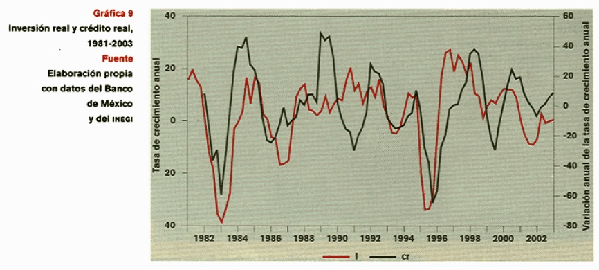 Un segundo factor que contribuyó al régimen de baja inversión fue el desenlace de la desregulación bancaria, el tipo de sistema bancario que surgió de la privatización. El resultado fue un oligopolio supercompetitivo en el que la conducta de los bancos se rigió por la toma de riesgos excesivos para capturar una mayor participación de mercado en el menor tiempo posible, aprovechando las fallas institucionales de regulación y supervisión financiera de la reforma económica (Gruben y Me Comb, 2003). Esta estrategia de mercado explica la persistencia del auge de crédito aun cuando después de la privatización el sistema bancario operaba en un nivel en que el costo marginal excedía al ingreso marginal, y hace inteligible el aumento de la cartera vencida y la creciente fragilidad financiera. La supercompetencia oligopólica incrementó el riesgo idiosincrásico del país, el daño moral de la privatización bancaria y, dada la macroeconomía de baja inflación, hizo más oneroso el costo financiero del capital. Puesto que un hecho estilizado de la economía capitalista es la presencia del ciclo de crédito (cf. Friedman, 1986; Semmler, 2003; Stiglitz y Greenwald, 2003), existe también una alta correlación entre el crédito y la inversión. La gráfica 9 muestra la volatilidad del crédito y la inversión en México después de la crisis de deuda de 1982. Se observa que el modelo bancario de supercompetencia oligopólica no ha ayudado a estabilizar a esas variables.