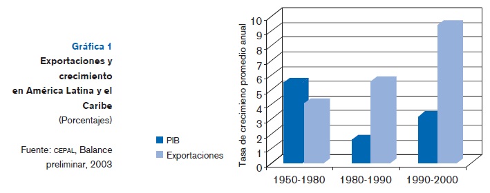 En el desempeño económico de América Latina en los noventa destacan el abatimiento de la inflación, el repunte de la actividad productiva impulsada por las exportaciones y la contracción de los déficit públicos. En efecto, la inflación, medida por las variaciones anuales del índice de precios al consumidor, ha registrado una tendencia a la baja y desde 1998 se ubica en niveles de un dígito. El alza a 12% en 2002 pronto fue controlada y se ubicó por debajo de 10% en 2003. En cuanto a la actividad económica, de 1990 a 2000 el PIB real de América Latina creció a una media de un poco más de 3% anual impulsada por las exportaciones que -conformadas más por manufacturas- crecieron a una media anual mayor de 9%. El contraste con el desempeño en la década de los ochenta es agudo, pues entonces las exportaciones crecieron más pausadamente y el PIB real aumentó a un ritmo inferior al de la expansión demográfica (véase la gráfica 1).
