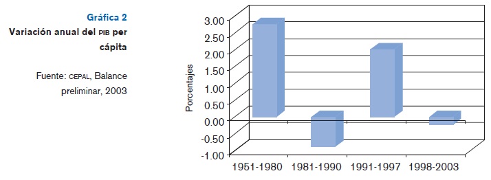 La expansión de las economías latinoamericanas, inaugurada en los noventa, permitió salir del estancamiento de la "década perdida". Pero fueron escasas las economías latinoamericanas que en ese lapso pudieron alcanzar un dinamismo mayor al que tuvieron durante 1950-1980 bajo el modelo basado en la sustitución de importaciones y la industrialización impulsada por la fuerte intervención del Estado. Las contadas economías cuyo PIB real tuvo un crecimiento favorable fueron Chile, Argentina, Bolivia y Uruguay, aunque ante la crisis de los tres últimos países en 2000-2003, Chile fue el único cuyo repunte económico en los noventa fue mayor al registrado en el período 1950-1980. Es decir, las reformas en América Latina fueron exitosas en un sólo caso en cuanto a insertar a la economía en una senda de crecimiento más elevado (véase la gráfica 2).