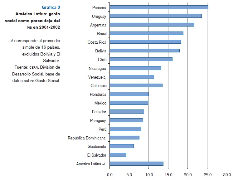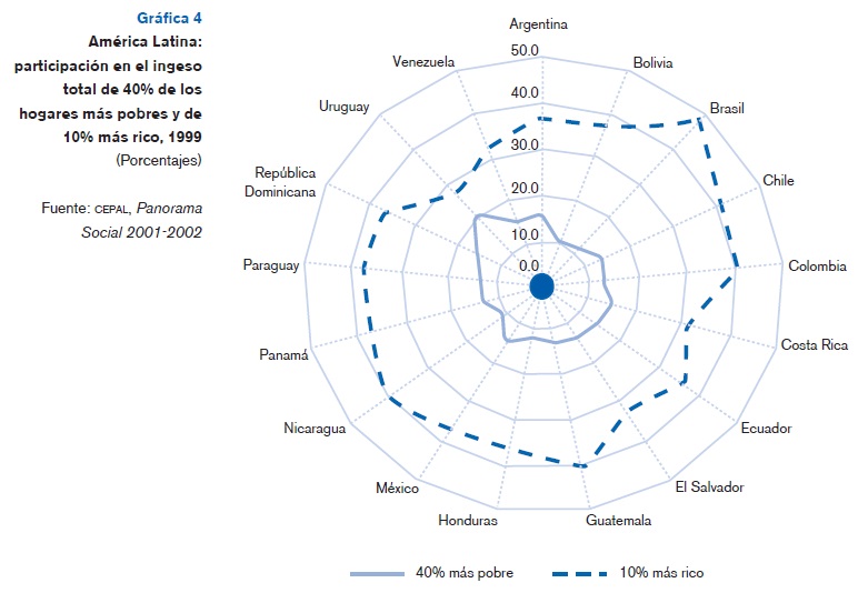 Además de una fuerte tendencia a la reproducción intergeneracional de la pobreza de vastos contingentes de su población, la dinámica económica y social de América Latina se caracteriza por una fuerte concentración del ingreso. De acuerdo a algunos analistas, se encuentra entre las regiones en que la repartición del ingreso es de las más inequitativas en el mundo (véase la gráfica 4).