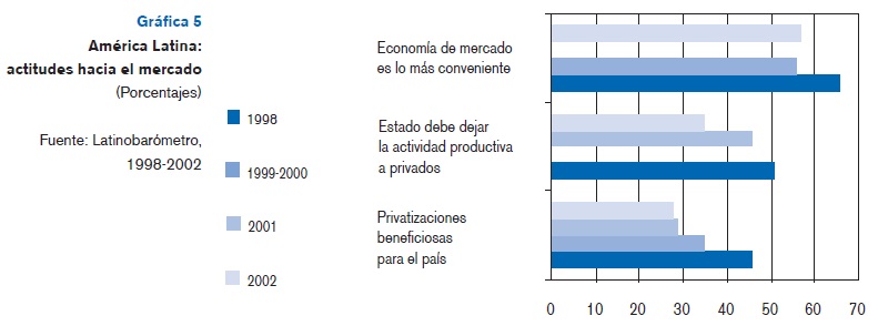 Sin embargo, es preocupante que amplios sectores de la población manifiesten desencanto con la democracia y sus instituciones. Es alarmante la apatía entre los jóvenes en torno a las elecciones y las cuestiones de política nacional. Ciertas encuestas muestran que entre la población latinoamericana las instituciones que menos confianza inspiran son los partidos políticos y los gobiernos. Desencanto que, por cierto, también se evidencia cada vez más en cuanto a los efectos de las reformas macroeconómicas. Por ejemplo, el porcentaje de la población que considera que la privatización beneficia al país se ha caído drásticamente en los últimos años. Mientras que en la segunda mitad de los noventa la mayoría de encuestados las veía positivamente, en 2002 solo 28% comparte dicha opinión. Ha sido notable la caída en la proporción de la población que considera que el Estado debe dejar totalmente la actividad económica al sector privado. En 1998, 51% de la población muestreada en el continente estaba a favor de dicha postura; en 2002 ese porcentaje cayó a 35 por ciento.
