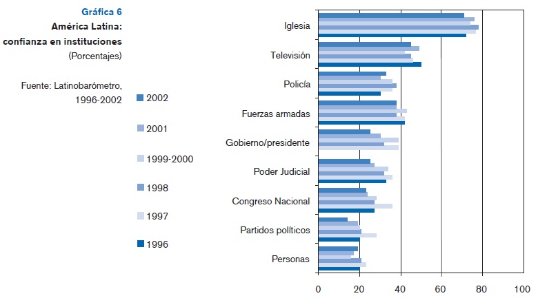 En este proceso, nuestros gobiernos se encuentran cada vez más en una posición crítica en que por un lado enfrentan a una sociedad civil progresivamente robustecida que denuncia y demanda cada vez más la intervención del Estado para la resolución de problemas específicos, muy particulares, y a veces en contra de procesos o agentes cuyo ámbito de acción es la economía globalizada. Por otra parte, las reformas macroeconómicas en la práctica se han traducido en Estados que han visto reducir drásticamente su gama de instrumentos de política económica y que carecen de recursos fiscales suficientes para atender la oferta mínima de bienes públicos. Sus posibilidades de acción se limitan más aún ante la escasa confianza que los gobiernos y partidos políticos inspiran entre la población. Las encuestas dan cuenta de manera sistemática que dichas instituciones inspiran, por ejemplo, mucho menos confianza que la televisión o la iglesia. En ese marco, se debilita enormemente la construcción de agendas de desarrollo de largo plazo (véanse las gráficas 5 y 6).