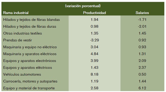 Salvo en los casos de prendas de vestir y equipo y material de transporte que destacan por aumentos de salarios perceptiblemente mayores a los incrementos en productividad o los casos, menores, en la rama de otras industrias textiles o en la de las carrocerías, motores y autopartes, en todas las demás actividades se pone en evidencia que las ganancias en productividad no se han reflejado en mejores salarios.
