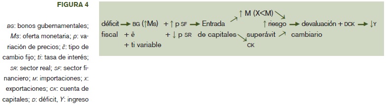 La figura 5 muestra las interrelaciones del período actual. Desequilibrios en la cuenta de capital activan políticas monetarias restrictivas, fundamentalmente por medio de bonos de regulación monetaria y de aumentos indirectos o directos en la tasa de interés, cuyo objetivo es desincentivar el crecimiento económico (expectativas negativas) que reducen el ingreso y las importaciones. Inversamente, cuando aumenta la entrada de capitales, se despliegan políticas monetarias expansivas, sube la liquidez, mejoran las expectativas y se activa el crecimiento económico. Cabe destacar que políticas monetarias restrictivas en caso de profundizarse el desequilibrio de la cuenta comercial, pueden volverse poco efectivas cuando las perspectivas futuras son buenas. Inversamente, la reducción de importaciones se dificulta después de cierto límite, por la reducida sustitución de importaciones por bienes nacionales.