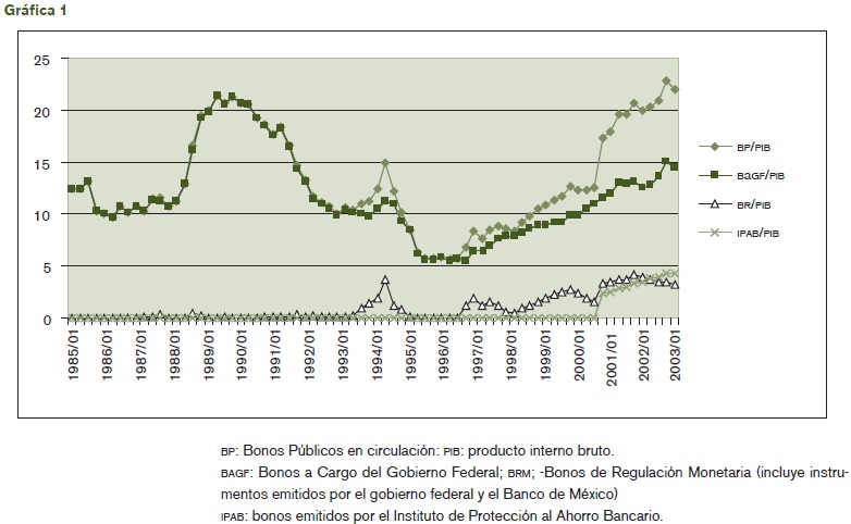En los ochenta, cuando se modificaron las fuentes de financiamiento del gasto público, los bonos públicos oscilan alrededor de 10% del PIB (véase la gráfica 1). La decisión del gobierno de prescindir de créditos bancarios e incidir sobre la liquidez del mercado y emitir títulos deuda que operan en el mercado de dinero (se sustituyen los bonos de deuda pública) da inicio en 1978, cuando se emiten por primera vez los Certificados de la Tesorería (Cetes).