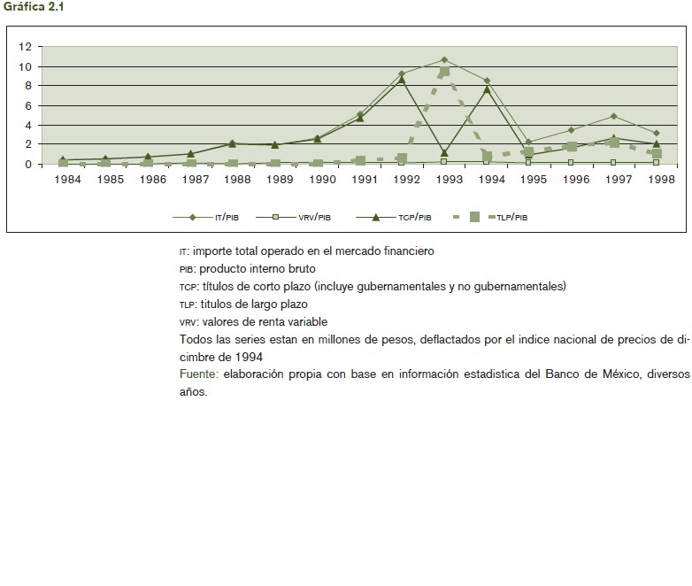 En resumen, la política monetaria se relaciona con la entrada y salida de capitales que a su vez determina los auges y los descensos de la actividad económica, a partir de lo cual se postula que la política monetaria es procíclica. Un segundo elemento significativo es la relación entre el importe total operado en el mercado de financiero y el producto interno bruto8 (véase la gráfica 2). Allí es posible percibir una profundización del sistema financiero. En 1984 el importe total operado en el mercado financiero es menor que el PIB, o sea, no alcanza a cubrir el monto total de la actividad económica. Sólo a partir de 1987 se presenta una relación uno a uno y a partir de dicho año tiene lugar un movimiento ascendente, alcanzando su máximo en 1993 (10.5 veces mayor que el monto total del PIB), el cual, posteriormente, empieza a descender, logrando una proporción de cuatro a uno en 1998.