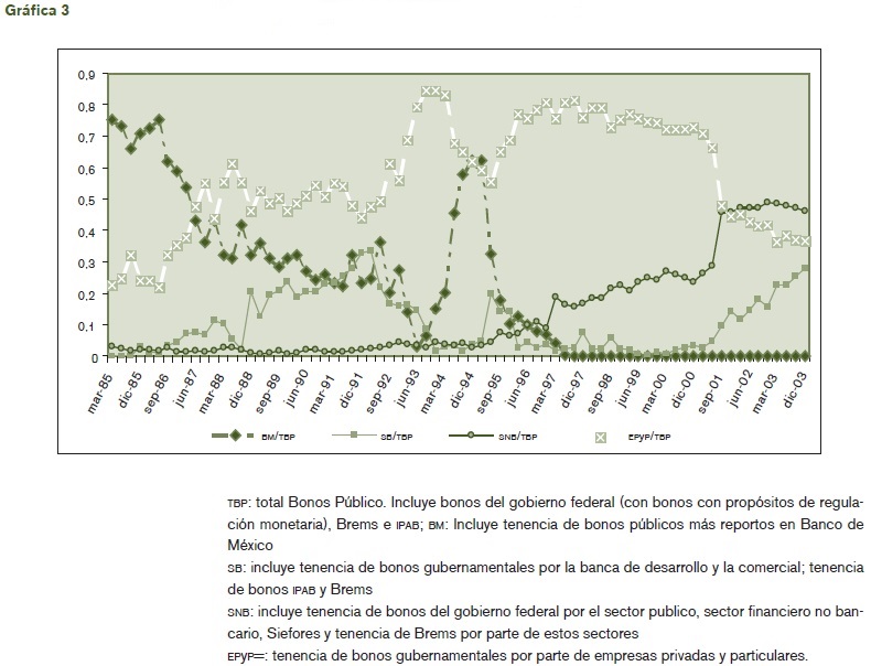Finalmente, se analiza el destino de la emisión de títulos públicos (incluyendo los bonos de regulación monetaria, emitidos por el gobierno federal y el banco central y por el Instituto para la Protección del Ahorro Bancario, IPAB) que muestra el efecto de los bonos gubernamentales sobre la liquidez de la economía. La gráfica 3 revela un gran movimiento gráfica 3 a lo largo del período en los tenedores de bonos.