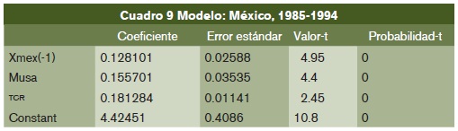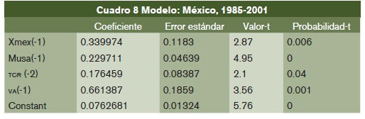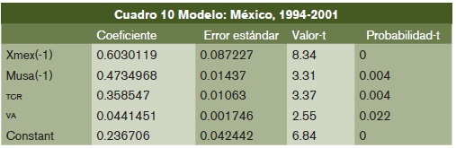 En los modelos de panel de datos para el caso mexicano se encontró que, en general, las variables que influyen sobre las exportaciones manufactureras son bastante parecidas a las correspondientes a la muestra del conjunto de países, aunque también el valor agregado ejerce un efecto positivo (véanse los cuadros 8, 9 y 10). Donde: