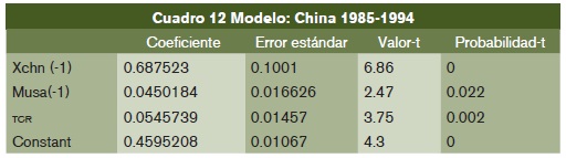 En el período 1985-2001 las exportaciones manufactureras chinas tienen como principal variable explicativa a las importaciones manufactureras de Estados Unidos, aunque la elasticidad es menor que en el caso mexicano. La propia variable dependiente impacta de manera positiva a las exportaciones, en tanto que el tipo de cambio real y el valor agregado (con dos rezagos) influyen de manera positiva, pero con una elasticidad reducida, al crecimiento de las exportaciones manufactureras chinas. El efecto de inercia de las exportaciones es bastante similar en los dos períodos. Sin embargo, la elasticidad de las exportaciones respecto del tipo de cambio real aumenta de manera significativa en el segundo período, siendo su valor de largo plazo de 1.45.