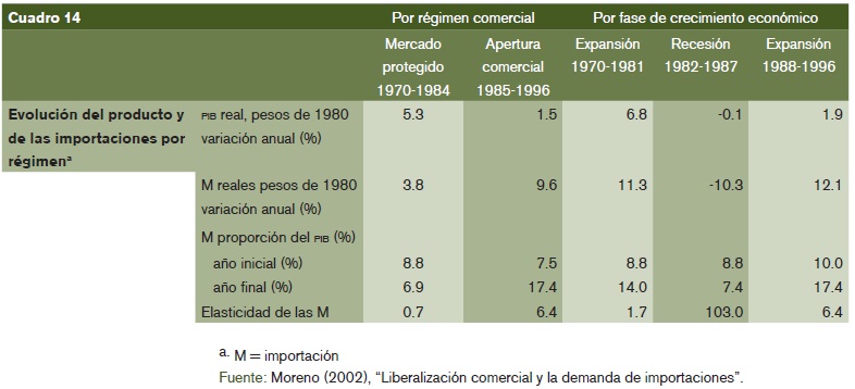 Aunque el crecimiento exportador del país fue notable, el lento crecimiento de la economía mexicana se podría entonces explicar debido a que la elasticidad-ingreso de las importaciones también creció notablemente. El cuadro 14 tomado de Moreno (2002) permite observar ese fenómeno.