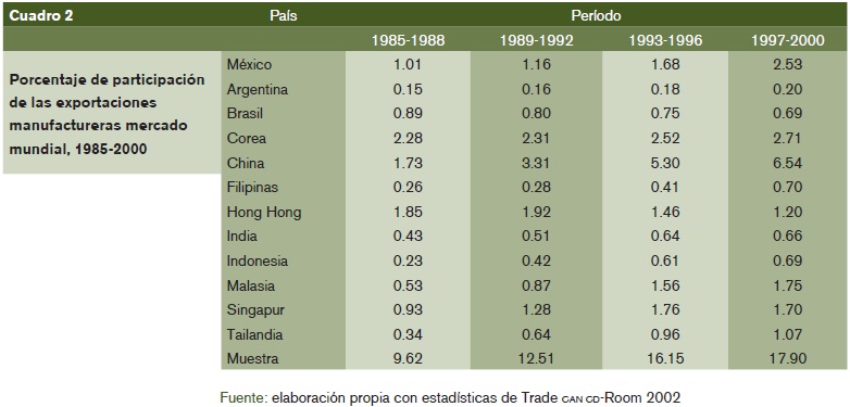 El cuadro 1 muestra la participación de los países de la muestra en la exportación en el mercado mundial; en el lapso 1985-2000 la participación de los países en desarrollo en el mercado mundial aumentó de manera muy significativa y de hecho la contribución de las economías de la muestra creció casi 8 puntos porcentuales. Naturalmente, no todos ellos tuvieron la misma dinámica exportadora y la misma penetración de mercado, pues sólo China, México y Corea aportaron 10.8% de las exportaciones que se realizaron en el mercado mundial en el año 2000, en tanto que los demás explican el otro 10 por ciento.