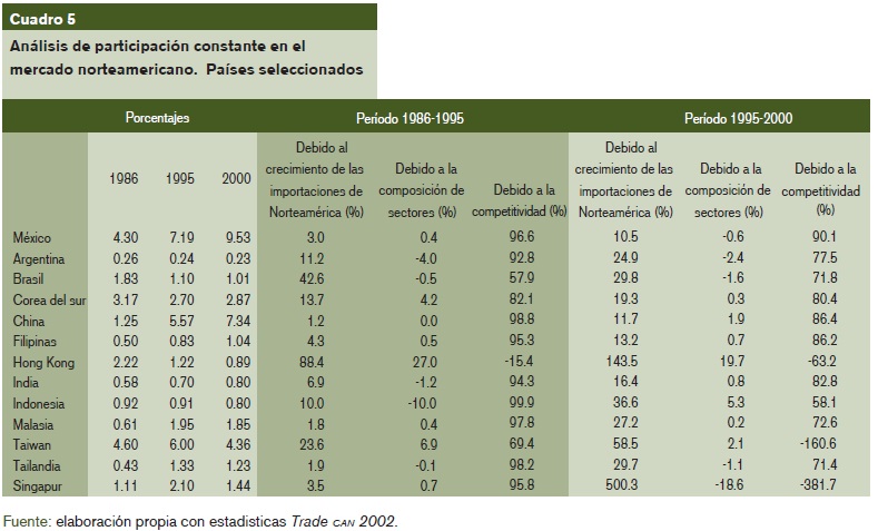La participación de los países de la muestra en el mercado norteamericano es significativa y creció en el período considerado de 16 a casi 23 por ciento. Los países responsables de este aumento fueron especialmente China y México; el primero aumentó 5.5 puntos porcentuales su participación y México 4.7 puntos. Corea, que en la segunda mitad de la década de los ochenta y principios de los noventa era el país con mayor participación de mercado, en 2000 fue desplazado al cuarto lugar, después de China, México e India. Otros países que perdieron participación fueron Argentina, Brasil, Hong Kong y Singapur.
