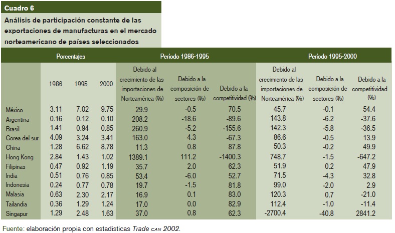México, por su parte, muestra una tendencia ascendente en su participación: 1.9% en 1986, 6% en 1995 y 9% en 2000. El determinante principal de este crecimiento en el lapso 1986-1995 fue la competitividad que explicó 78% del crecimiento; de 1995 a 2000 el efecto de la demanda determinó 41% del crecimiento.