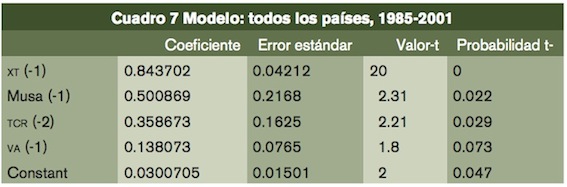 En el análisis econométrico se encontró en todos los casos que las exportaciones manufactureras tuvieron un componente inercial significativo; ello sugiere que una vez que logran exportar a un cierto mercado tienden a mantener su presencia. Se constató, asimismo, que el tipo de cambio real esto es, la competitividad de precios también tiene un papel relevante en el desempeño exportador de esos países. Por último, se observó que la marcha interna de la economía por la vía de la acumulación de capital o de la evolución del valor agregado se asocia positivamente con el desempeño exportador.