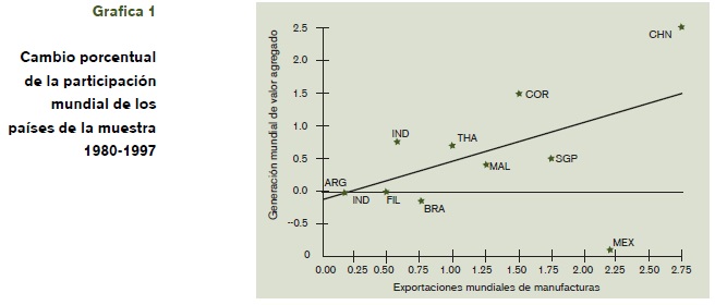 En lo que sigue se exponen unas breves reflexiones sobre los efectos macroeconómicos de las exportaciones manufactureras. El tema es muy vasto y lo que aquí se expone sólo debe entenderse como una primera aproximación. La gráfica 1 anexa puede constituir un buen punto de partida, pues ahí se compara, para todos los países de la muestra, el cambio de la participación mundial en las exportaciones de manufacturas mundiales contra el cambio en la participación de generación de valor agregado mundial.