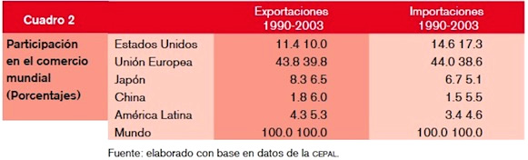 El fuerte incremento del comercio internacional de México se ha relacionado poco con los países latinoamericanos. Desde este ángulo, la estadística es, una vez más, un indicador elocuente de la concentración del comercio exterior de la economía mexicana: para 2004, América Latina sólo representó 5% del comercio internacional de México; mientras que América del Norte acaparó 75% con el predominio de Estados Unidos (72% del total).