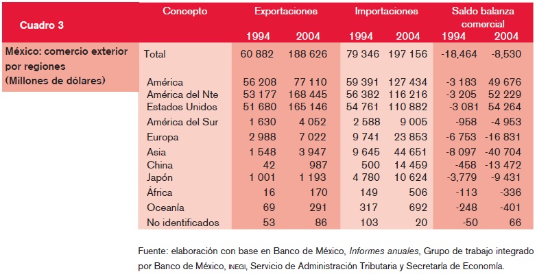 Las exportaciones de México hacia Estados Unidos han ido en ascenso. Para 2004, éstas representaron 87.6% de las exportaciones totales del país. Por lo demás, la participación de otras regiones del mundo en las exportaciones del país fue poco importante, y exhibió además un comportamiento hacia la baja. Entre 1994 y 2004, Europa disminuyó su compra de exportaciones mexicanas de 4.9 a 3.7%, mientras que las adquisiciones de Asia descendieron de 2.5 a 2.1 por ciento.
