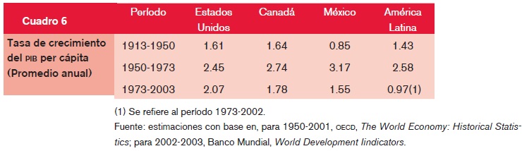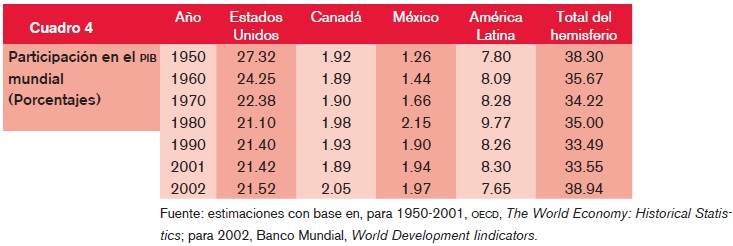 En sus aspectos generales, la participación en el PIB del hemisferio exhibe el grado de desarrollo asimétrico entre los países miembros (véase cuadro 5). Entre 1950 y 2003, el comportamiento promedio indica que Canadá fue el país que mantuvo una participación en ascenso, con casi 6%; pero Estados Unidos generó poco más de 70% del PIB continental, a pesar de su menor incidencia en el producto mundial; mientras que América Latina, con su tendencia hacia la baja, aportó menos de 25 por ciento.