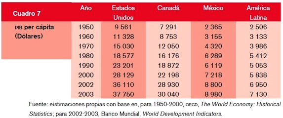 19. Lo mismo ha sucedido entre Estados Unidos y el conjunto de América Latina. Sólo que, por la diversidad de las condiciones económicas entre los países latinoamericanos, la diferencia entre el PIB per-cápita de Estados Unidos y el promedio de América Latina fue aun mayor que la que se presentó entre México y Estados Unidos.