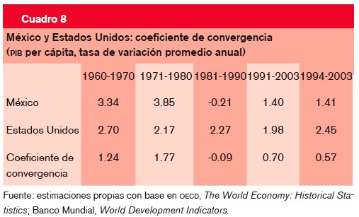 El cuadro 8 presenta la información del PIB per cápita de México y de Estados Unidos entre 1960 y 2003. Con esta información se calcularon los coeficientes de convergencia entre ambos países a través del cociente: PIB per cápita de México/PIB per cápita de Estados Unidos. Un coeficiente con valor mayor a 1 (menor a 1) indica que la diferencia entre las tasas de variación del PIB per cápita de ambos países disminuye (aumenta) a favor (en contra) del país atrasado. Como se puede apreciar, en el período 1960-1980, que ubica al período de la ISI en México, el coeficiente de convergencia tuvo un valor mayor a 1 señalando el avance de la productividad en México y la reducción de la brecha entre ésta y la productividad de Estados Unidos. La década de los setenta, que correspondió a la etapa más intensa y de mayor avance de la ISI, fue la más dinámica, con un coeficiente de convergencia de 1.8. No obstante, a partir del proceso de AyD de la economía mexicana, el valor del coeficiente fue menor a 1. En los años ochenta, incluso, este coeficiente fue negativo (-0.1); y desde la década de los noventa, que contempla la puesta en práctica del TLCAN, el valor del coeficiente no sólo fue menor a la unidad sino que también mostró una tendencia descendente.