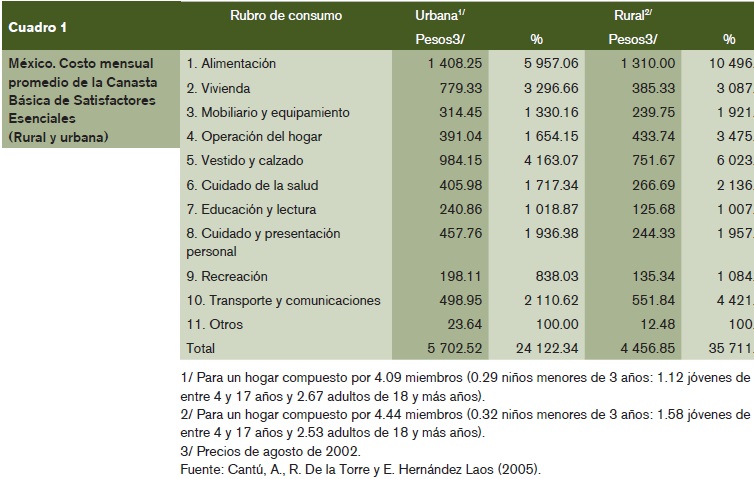 La información contenida en ambas investigaciones permite, así, integrar dos canastas básicas de satisfactores esenciales, una rural y otra urbana, que incluyen tanto los bienes alimentarios como los no alimentarios, y cuyo costo da pie para establecer los correspondientes umbrales de pobreza en México. El Cuadro 1 ofrece una breve descripción del contenido de las canastas para hogares típicos, así como la cuantía de su costo mensual promedio.8 Los distintos rubros de gasto se integran en once acápites que cubren, de manera relativamente austera, las necesidades esenciales de los hogares nacionales típicos en las diversas categorías, como son la alimentaria, la de vivienda, las de mobiliario, equipamiento y operación del hogar, los requerimientos de vestido y calzado, educación y cuidado de la salud, los de presentación personal, la recreación, el transporte y las comunicaciones, y otros rubros menores (Cantú, De la Torre y Hernández Laos, 2005).9