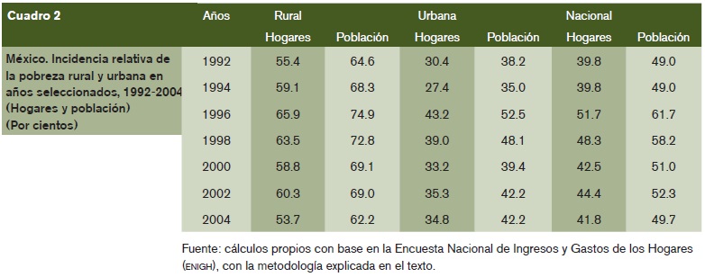 21. Podría postularse como hipótesis, de hecho, que las medianamente favorables tendencias observadas en el medio rural, más que efecto de la política social, habrían sido consecuencia del acrecentamiento de las remesas del creciente número de mexicanos que ha tenido que emigrar al extranjero por la insuficiencia de oportunidades laborales en territorio nacional. Pero aun ello no ha podido revertir la aguda vulnerabilidad a la pobreza de los hogares más desprotegidos de la escala social.